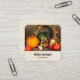 Cartes de visite avec une photo d'une récolte d'action de grâce, posée sur une table en bois rustique. Citrouille, pommes de terre, courge etc... composent cette belle collection de nourriture. Des feuilles d'automne colorées entourent le panier de la cornucopie.
