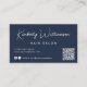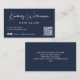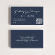 Carte de visite bleu chic présentant votre nom ou marque dans un script de signature blanc moderne et votre type d'entreprise ou titre en lettres blanches propres. Entrez l'adresse de votre site Web pour créer un code QR que les clients et les clients peuvent rechercher pour une liste de vos produits, services, heures, etc., et ajoutez vos identifiants utilisateur instagram et facebook pour que les clients puissent suivre et se connecter avec vous sur les médias sociaux. Ajoutez des informations supplémentaires sur le dos ou laissez-les en blanc.