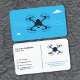 Un carte de visite pour des activités utilisant des drones tels que la photographie aérienne, les photos de ville, pilote d'UAV, drone agricole, location de drones, etc. Elle est accompagnée d'une illustration d'un drone volant dans un ciel bleu. Sur le dos, on trouve les coordonnées complètes décorées d'icônes et l'illustration d'un drone.