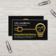 Une couverture entièrement noire présente une conception créative de câblage électrique maison faux or. En haut de la carte se trouve votre nom prestigieux et votre titre professionnel. Vers la base est le nom commercial "Electrical Service" en jaune à côté des coordonnées. Un logo de bougie dorée que vous pouvez utiliser est en haut suivi de votre nom prestigieux, des coordonnées et une option de légende de slogan que vous pouvez modifier pour répondre à vos besoins de service. Une grande carte créative pour les électriciens à utiliser. #électricien #électricité #entrepreneur électrique #réparations électriques #électricité #ingénieur électrique #éclairage #bulbe #plug #zazzlemade