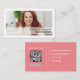 Un design simple comprend un modèle de carte de visite de code QR, avec une photo simple, et un style professionnel moderne, avec un code barre scannable pour le site Web ou les médias sociaux, un design chic minimaliste et tendance, avec des détails de contact minimes, et un arrière - plan de pêche rose au fond, un carte de visite photo.