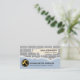 Un mur en brique grise avec une zone découpée abrite votre nom prestigieux et votre titre professionnel. Juste en dessous, dans le mur en plâtre bleu, vous trouverez un logo de marteau doré que vous pouvez utiliser, à côté du nom d'entreprise et de ses coordonnées.