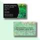 Paysagiste professionnel cartes de visite uniques avec l'image de l'aménagement paysager dans l'arrière - plan des deux côtés et un slogan sur le dos demandant des références.