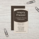 Professional Executive Curves design carte de visite en espresso. Cette carte de profil épurée est un excellent choix pour une personne qui souhaite faire une bonne première impression. Un choix parfait pour les professionnels du secteur financier tels que les planificateurs d'investissement, les analystes, les agents de prêts ou les agents d'assurance. Pour que ce design soit le vôtre, ajoutez vos informations personnelles et commerciales dans les champs fournis. Les polices et les couleurs de texte peuvent être modifiées en cliquant sur le bouton "Customiser!".