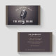 Vocal Coach Carte de visite a un design élégant dans un style minimaliste avec juste un projecteur du microphone avec une couronne sur un arrière - plan en bois foncé, un brun complémentaire bandes verticales des deux côtés et une typographie blanche contrastant la couleur à l'arrière - plan. Il est considérablement vintage quant au style microphone avec une touche moderne.