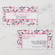Un carte de visite au design composé de lunettes de soleil aux yeux de chat roses et noires rétro, de porte-monnaie rose avec pois gris, de porte-monnaie rose avec arc noir, de rouge à lèvres roses, de pierres gemmes roses et d'une bouteille de parfum avec atomiseur rose. Personnalisez le texte à l'avant et à l'arrière avec vos informations.