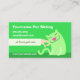 Carte de visite pour les chaises longues dans des tons vert vif. Un chat souriant se penche dans un bras mousseux.