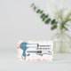 Un carte de visite avec un arrière - plan motif en terrazzo aux couleurs inspirées du désert à l'avant et à l'arrière. Le dossier contient les coordonnées du contact. Les caractéristiques avant sont assorties à un sèche-cheveux bleu et à un fer à repasser pour le temps et la date de rendez-vous.