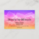 Un arrière - plan en dégradé allant du violet royal au sommet à l'orange doré au fond, bisé par une vague de fumée blanche, crée le carte de visite parfait et professionnel pour un magasin de beauté. Le dos est une version plus légère du dégradé, avec espace pour plus d'informations, récompenses de fidélité client, ou pour les rendez-vous.