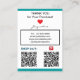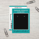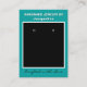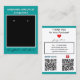 Bijoux faits main et nom en blanc sur fond bleu sarcelle. "Créé avec amour" écrit en noir (conserver ou insérer un court slogan, ou supprimer pour laisser la zone vide). Deux petits cercles sur fond encadré noir et blanc. REMARQUE : les cercles ne sont pas pré-découpés, vous devrez utiliser un petit perforateur pour faire des trous nets, puis y placer vos boucles d'oreilles. Arrière : insérez le numéro de téléphone, l'adresse e-mail, le site Web, la poignée de média social, selon les besoins. Insérez le code QR de votre entreprise sur le côté gauche pour que les clients puissent magasiner 24h/24 et 7j/7, et le code QR du lien du site de médias sociaux Pinterest (ou autre) sur le côté droit (laisser l'icône Pinterest, ou insérer d'autres icônes de médias
