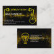 Une onde jaune électrifiante s'écoule sur la face de la carte alimentant le courant des câbles de la prise d'alimentation et de l'ampoule. Votre titre de travail "électricien" au sommet peut être modifié pour répondre à vos besoins professionnels. Juste en dessous, vous trouverez votre nom prestigieux ainsi que les coordonnées de la base.