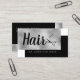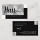 carte de visite moderne pour coiffeurs ou coiffeurs avec ciseaux, faux arrière - plan argent et noir, élégante police calligraphie.