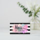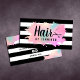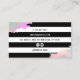 Carte de visite moderne avec rayures noir et blanc, dégradé faux or rose, texture verte et violette, ciseaux et élégante police calligraphie.
