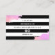 Carte de visite moderne avec rayures noir et blanc, dégradé faux rose or & texture violette, ciseaux et élégante police calligraphie.