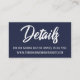 Gardez vos invités dans la boucle concernant tous vos détails liés au mariage avec ces jolies cartes d'encarts pour mariage. Ces jolies cartes reflètent un style élégant et décontracté. Les superpositions de texte élégantes ont été conçues à l'aide d'une police de script moderne, audacieuse et décontractée ; l'une des faces affiche "Save the Date" et l'autre, simplement "Details". Utilisez les champs modèles pour customiser ces cartes de boîtier avec vos informations personnelles. Imprimé à l'aide de la "technologie carte de visite", la taille pratique sera facile à garder à portée de main. Envoyez-les avec vos envois traditionnels, et gardez quelques-uns autour pour les partager avec ceux qui ont besoin d'un ou deux supplémentaires! L'arrière - plan est recouvert d'une marine sophistiquée et cette couleur modifiable peut être changée en n'importe quoi de votre palette mariage que vous choisissez; tout le texte est blanc. // 89 // Conçu par Melody Watson pour Paper Muserie.