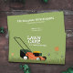Un carte de visite de soins de la pelouse verte illustrant un paysage avec de l'herbe, des fleurs et une tondeuse à gazon. Il pourrait convenir aux personnes qui travaillent dans le domaine de l'aménagement paysager, comme l'aménagement paysager, tondre et entretenir la pelouse, l'entretien des espaces verts.