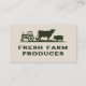 Un carte de visite agricole sur un arrière - plan beige avec une illustration comprenant un tracteur, une vache, un cochon et un poulet. Les coordonnées complètes sont disponibles sur le dos et sont décorées d'icônes.