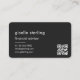 Professional business card designed for financial advisors using a sleek black color palette. The layout includes a QR code to share online information while keeping the design clean and easy to read. Suitable for financial advisors, planners, and finance professionals. Fully customizable text and QR destination with a print-ready layout.