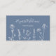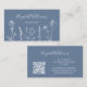 Un carte de visite professionnel avec des fleurs sauvages blancs sur un arrière - plan bleu poussiéreux et un texte dans une police manuscrite élégante. Design chic boho floral moderne avec un code qr sur le dos. Parfait pour les fleuristes, les coiffeurs, l'aménagement paysager, les organisateurs d'événements....