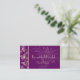 Cette conception de carte de visite est sûre d'attirer l'attention et de vous aider à se tenir dans la foule. L'arrière - plan est prune pourpre et il y a un beau graphique floral en crème lui donnant un regard élégant. Perfectionnez pour n'importe quelles affaires mais particulièrement grand pour le salon nuptiale, en épousant la planification, planification d'événement, restauration, salon de clou, spa, des bijoux, cosmetologist, mode, consultant en matière de beauté, ou quand vous voudriez un contact élégant. Ajoutez votre information et il est prêt d'aller !