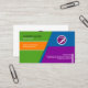 Un bombardement de couleurs multi. Une carte pour vous inciter à se tenir. Un grand trapèze bleu lumineux se repose près du mur droit, se tenant dessus sur votre logo ; directement ci-dessous à une nuance plus foncée de pourpre, sont tous vos détails de contact d'affaires. Ceci est rendu important par un filet blanc venant du plancher de la carte. Près de la section médiane il y a rectangle orange lumineux, rendu élégant par une couche translucide dessous. Dans cet espace, vous faites tenir vos détails personnels de contact, dans la grande estime pour le nom et la fonction juste ci-dessus, à une nuance encore plus lumineuse de vert comme arrière - plan. Au verso, vous avez une option supplémentaire de logo ; vous pouvez télécharger une photo si vous souhaitez ainsi, les dimensions êtes 1,000x1,000pix. Sous le logo sont les détails d'affaires plus une entrée facultative de slogan. C'est un design de carte simple, avec de nombreuses options pour la personnalisation. Bon pour toutes les entreprises et professions.