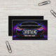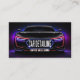 L'élégant et moderne carte de visite Détailing de voiture a une illustration de voiture noire avec des lumières de néon rouge, bleu et violet sur un arrière - plan noir, un nom sur le devant, et une typographie scénarisée qui dit "détails de voiture" en majuscules. Ajoutez plus de personnalisation en ajoutant vos coordonnées à l'arrière.