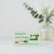Carte de visite à coudre sur mesure en vert pâle, avec des graphismes d'une machine à coudre verte et or, au milieu et un coussin à épingle et ciseau, dans le coin inférieur gauche. Personnalisez tous les champs de texte correspondant à vos besoins professionnels. Choisissez le stock de carte que vous préférez avec ce design.