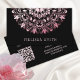 La partie supérieure de l'avant est ornée d'un mandala floral métallique complexe rose sur un arrière - plan noir. La partie inférieure comprend un champ de texte noir avec un élégant script manuscrit moderne. À l'arrière, il y a un code qr scannable pour votre site Web. Parfait pour salon, coiffure et maquillage, beauté, professeur de yoga, boutique ou toute femme entrepreneur.