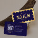 Cartes de visite élégants et chics à ongles en bleu marine et or avec une arête coquetée, police rétro et scannable un code QR. Créez des cartes de visite d'artiste moderne pour votre salon de clous en utilisant ce faux design carte de visite d'effet de feuille d'or. Ajoutez votre code QR, logo, coordonnées, et voilà, vous avez vos cartes de visite de manucure personnalisés.