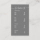 Moderne Elégant Simple Grey Spa Salon Service Menu Carte de visite. Customisez ce carte de visite de menu gris moderne et élégant pour créer facilement une liste de prix pour vos services. Parfait pour les salons de cheveux, les salons d'ongles, les services d'agrandissement et de maquillage, les bars de beauté, les spas, les services esthétiques et bien plus encore. Contactez-nous si vous avez besoin d'aide : yourstyle@pgco-designs.com.