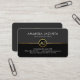 A dark grey and black layered cover is demarcated by a thin faux gold line near the card's center. Resting on this line is your name initials-monogram inside a gold circle. At the top of the card is your prestigious name and job title with the contact details southwards at the base.