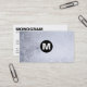 Un modèle de carte de visite simple et moderne avec un centre de 0,8" avec une lettre de monogramme, et un fond texturé d'image. Toutes les autres informations, c'est-à-dire le nom de l'entreprise, le type d'activité, le nom, le poste, l'adresse, la téléphonie, le web et l'email au verso sont disposés avec une ligne horizontale centrée. Cette carte peut bien sûr être personnalisée de nombreuses manières. Un design élégant et accrocheur adapté à de nombreux types d'entreprises.