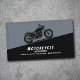 A professional business card featuring a sleek black motorcycle silhouette, positioned diagonally across the card, conveying speed and professionalism in a color palette of black, silver, and dark blue gray. It could also be used for automotive or motorcycle-related services (sales, shop, repair, motorcycle school, etc).