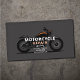 A professional business card design for a motorcycle repair shop featuring a sleek black motorcycle silhouette with chrome accents against a dark gray background with orange accent details. You can also find a wrench. It could also be used for automotive or motorcycle-related services (sales, shop, repair, motorcycle school, etc).