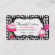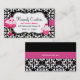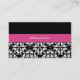 Joli carte de visite de boulangerie fait dans une damassé noire et blanche, avec le pois rose, une bande rose lumineuse, à travers le milieu, et un secteur blanc bordé noir décoratif des textes, sur l'avant. Les graphiques colorés adorables des petits gâteaux roses, blancs, et verts décorent les deux côtés, de la plaque des textes. Le texte est entièrement personnalisable pour adapter à vos besoins d'affaires. Grand pour à la maison des boulangers aussi.