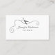 Un design simple en noir et blanc avec des ciseaux stylisés coupant un fil de cheveux bouclé.