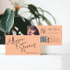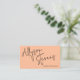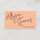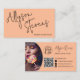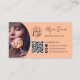 Un carte de visite maquilleur et coiffeur moderne et audacieux, avec un nom surdimensionné à l'avant, avec une police et une photo manuscrites, un code qr et des médias sociaux à l'arrière sur la pêche. Toutes les couleurs sont modifiables.