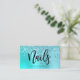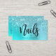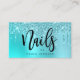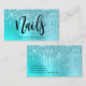 Ce superbe design carte de visite de technicien de clous présente une fausse menthe bleue et turquoise goutte à goutte parties scintillant texture métallique et élégante police calligraphie.