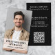 Carte de visite moderne avec votre photo superposée avec votre profession et nom en typographie audacieuse et tendance. À l'arrière, ajoutez l'adresse URL de votre site Web pour créer un code QR scannable et personnalisez avec vos coordonnées en simple typographie blanche sur un arrière - plan noir.