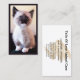 Le devant carte de visite présente ma photo de gros plan verticale d'espace réservé de cet adorable chaton siamois. Tous les renseignements commerciaux sont au verso de la carte dans un format horizontal. Remplissez les champs de modèle avec vos informations, supprimez tout texte et/ou utilisez l'outil de conception de modification pour sélectionner un style de police, une taille et une couleur que vous préférez. Conservez ou remplacez la photo de l'espace réservé par votre photo au format vertical, votre art/logo ou laissez-la telle quelle. Avec une photo liée à l'animal, ce design fonctionne pour les emplois liés à l'animal et plus particulièrement pour les marcheurs de chiens, les animaux assis, les soins aux animaux ou les parents d'accueil. Changez la photo pour une autre entreprise.