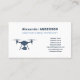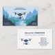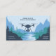 Un carte de visite pour des activités utilisant des drones, la photographie aérienne, pilote de drone, drone agricole, location de drones, etc. Elle est accompagnée d'une illustration d'un drone survolant un paysage pittoresque. Le drone est équipé d'une caméra qui capture le paysage. Le paysage comprend des montagnes, des arbres et un plan d'eau. Sur le dos, on trouve les coordonnées complètes et une illustration du drone.