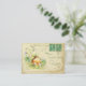 Un petit bébé robin est assis dans les violettes. Le arrière - plan est des morceaux d'éphémère et de carte postale vintage avec grunge et vieux timbres.