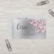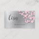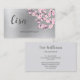 Cette carte de visite professionnelle présente des branches de fleurs de cerisier roses sur un fond en feuille d'argent faux et une grande calligraphie manuscrite pour votre nom. Carte de visite florale de luxe adaptée aux artistes maquilleurs, spas, paysagistes, organisateurs de mariage, organisateurs d'événements, cosmétologues, salons de beauté...