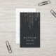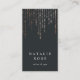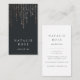 Un design carte de visite vertical simple et élégant est doté d'un lettrage blanc classique sur un arrière - plan noir souple et riche, avec des fils verticaux de fils de ficelle rose en or qui descendent du haut. Personnalisez avec deux lignes de texte personnalisé sur le devant, et ajoutez vos coordonnées complètes au verso.