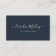 Un design carte de visite simple et élégant présente votre nom ou votre nom d'entreprise dans une typographie moderne en écriture blanche sur un arrière - plan bleu marine immaculé. Ajoutez une ligne de texte supplémentaire sous la forme d'un bloc de lettres propre et moderne pour votre occupation ou titre. Personnalisez l'envers avec vos coordonnées. Un choix chic et professionnel dans la marine classique et blanc pour toute occupation.