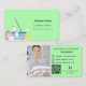 Un arrière - plan vert clair décoré de matériel de nettoyage. Personnalisez et ajoutez votre photo, nom, informations de contact textuel et votre propre code QR à votre adresse de site Web. Texte noir.