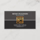 Une rétro conception simple. La carte est divisée en moitiés de gris et de noir. Une ligne blanche délimite ces deux colonnes. Au centre est un motif carré d'or d'une scène à la maison. Votre nom et fonction sont au dessus suivi des détails de raison sociale et de contact à la base.