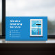 Un carte de visite bleu pour les services professionnels de nettoyage de fenêtres. Il est fourni avec toutes les informations de contact décorées avec des icônes, et la liste des services à l'arrière! Sur la droite, il y a une illustration d'une fenêtre avec du verre propre et un siège.