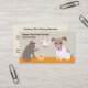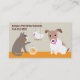 Carte de visite pour les sièges d'animaux avec chien, chat, oiseau et poisson à l'avant, vos coordonnées à l'arrière. Un design sympa avec le chat qui nourrit le poisson pendant que le cockatoo blanc regarde. Le chien dans le collier rose est à droite.