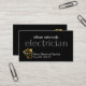 Une couverture entièrement noire est munie d'une signalétique translucide "électricien" près du centre de la carte. En haut se trouve votre nom prestigieux avec un logo de circuit d'ampoules d'or que vous pouvez utiliser à la base en plus du nom d'entreprise et des coordonnées. Au-dessus de la feuille, les détails de la carte sont sur la droite avec le logo or en haut. Il est suivi par votre nom prestigieux, les coordonnées et une option de slogan pour faire connaître vos services. C'est une carte créative à utiliser par les électriciens.